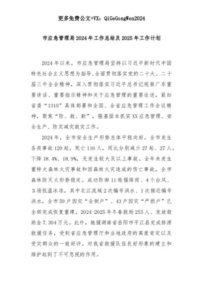 【七哥公文】2025年:市应急管理局2024年工作总结及2025年工作计划+更多免费公文+VX:QiGeGongWen2024+更多免费公文+VX:QiGeGongWen2024