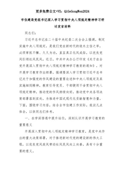 【七哥公文】2025年:市住建局党组书记深入学习贯彻中央八项规定精神学习研讨发言材料+更多免费公文+VX:QiGeGongWen2024+更多免费公文+VX:QiGeGongWen2024