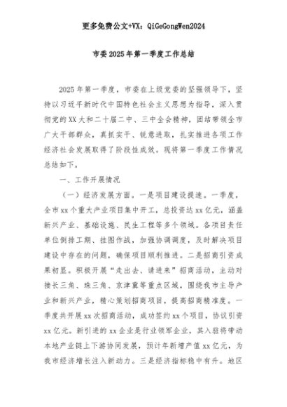 【七哥公文】2025年:市委2025年第一季度工作总结+更多免费公文+VX:QiGeGongWen2024+更多免费公文+VX:QiGeGongWen2024