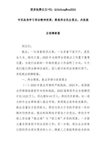 【七哥公文】2025年:市民政局学习两会精神党课:聚焦两会民生要点,共筑就业保障新篇+更多免费公文+VX:QiGeGongWen2024+更多免费公文+VX:QiGeGongWen2024