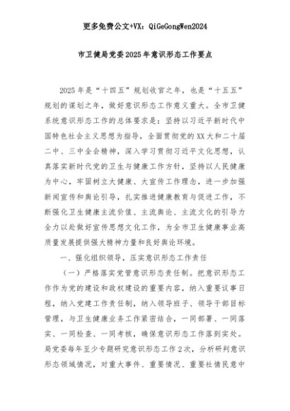 【七哥公文】2025年:市卫健局党委2025年意识形态工作要点+更多免费公文+VX:QiGeGongWen2024+更多免费公文+VX:QiGeGongWen2024