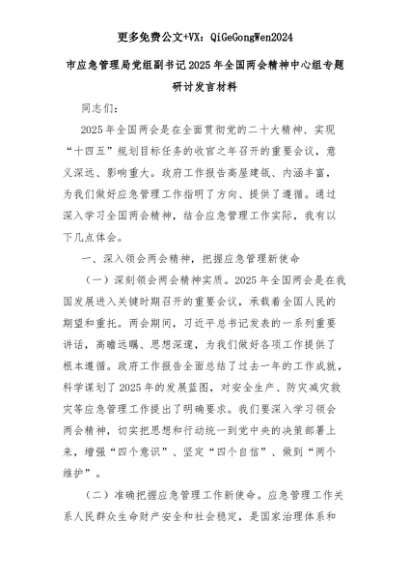 【七哥公文】2025年:市应急管理局党组副书记2025年全国两会精神中心组专题研讨发言材料+更多免费公文+VX:QiGeGongWen2024+更多免费公文+VX:QiGeGongWen2024