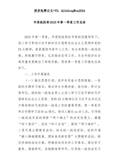 【七哥公文】2025年:市委统战部2025年第一季度工作总结+更多免费公文+VX:QiGeGongWen2024+更多免费公文+VX:QiGeGongWen2024