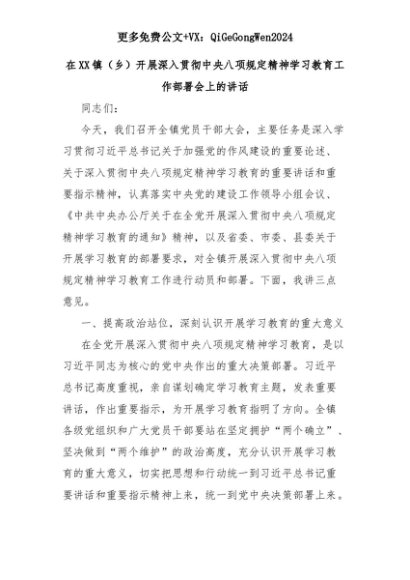【七哥公文】2025年:在XX镇(乡)开展深入贯彻中央八项规定精神学习教育工作部署会上的讲话+更多免费公文+VX:QiGeGongWen2024+更多免费公文+VX:QiGeGongWen2024
