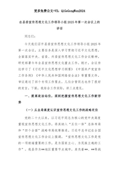 【七哥公文】2025年:在县委宣传思想文化工作领导小组2025年第一次会议上的讲话+更多免费公文+VX:QiGeGongWen2024+更多免费公文+VX:QiGeGongWen2024