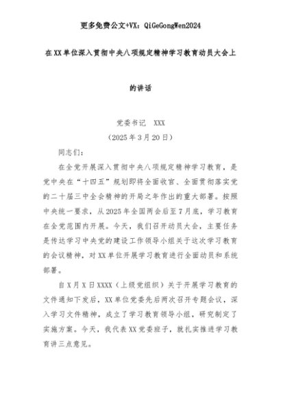 【七哥公文】2025年:在XX单位深入贯彻中央八项规定精神学习教育动员大会上的讲话+更多免费公文+VX:QiGeGongWen2024+更多免费公文+VX:QiGeGongWen2024