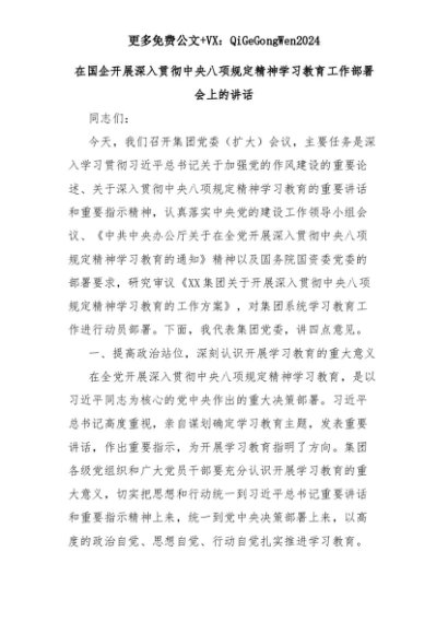【七哥公文】2025年:在国企开展深入贯彻中央八项规定精神学习教育工作部署会上的讲话+更多免费公文+VX:QiGeGongWen2024+更多免费公文+VX:QiGeGongWen2024