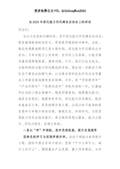 【七哥公文】2025年:在2025年深化能力作风建设启动会上的讲话+更多免费公文+VX:QiGeGongWen2024+更多免费公文+VX:QiGeGongWen2024