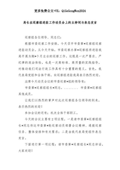 【七哥公文】2025年:局长在巡察组进驻工作动员会上的主持词与表态发言+更多免费公文+VX:QiGeGongWen2024+更多免费公文+VX:QiGeGongWen2024