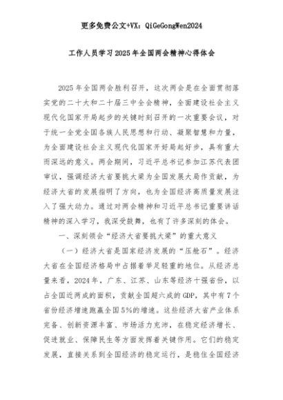 【七哥公文】2025年:工作人员学习2025年全国两会精神心得体会+更多免费公文+VX:QiGeGongWen2024+更多免费公文+VX:QiGeGongWen2024
