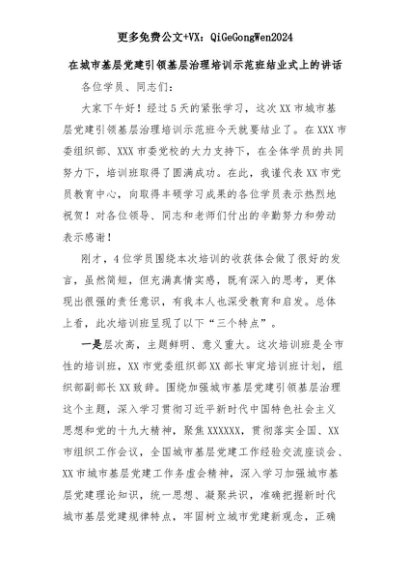 【七哥公文】2025年:在城市基层党建引领基层治理培训示范班结业式上的讲话+更多免费公文+VX:QiGeGongWen2024+更多免费公文+VX:QiGeGongWen2024