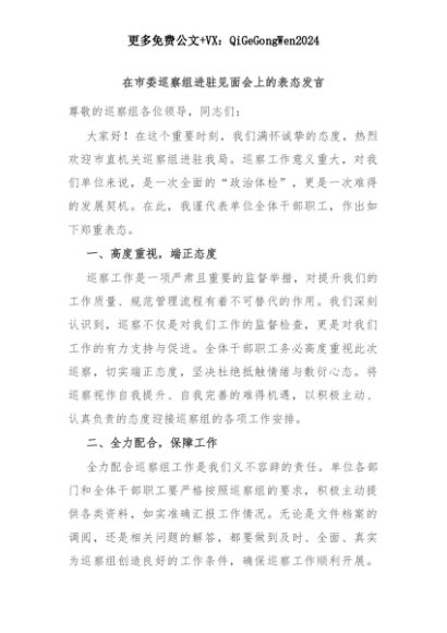 【七哥公文】2025年:在市委巡察组进驻见面会上的表态发言+更多免费公文+VX:QiGeGongWen2024+更多免费公文+VX:QiGeGongWen2024