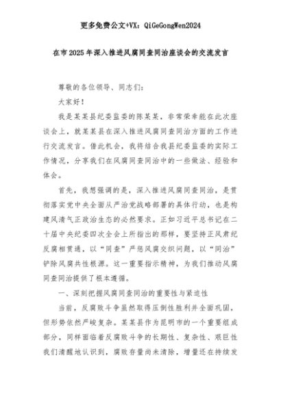 【七哥公文】2025年:在市2025年深入推进风腐同查同治座谈会的交流发言+更多免费公文+VX:QiGeGongWen2024+更多免费公文+VX:QiGeGongWen2024