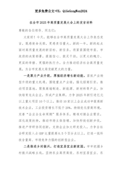 【七哥公文】2025年:在全市2025年高质量发展大会上的发言材料+更多免费公文+VX:QiGeGongWen2024+更多免费公文+VX:QiGeGongWen2024
