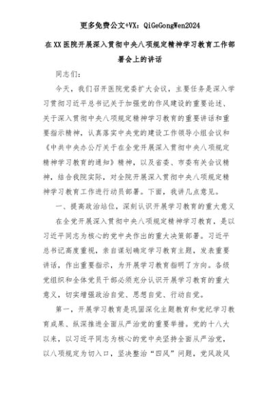 【七哥公文】2025年:在XX医院开展深入贯彻中央八项规定精神学习教育工作部署会上的讲话+更多免费公文+VX:QiGeGongWen2024+更多免费公文+VX:QiGeGongWen2024