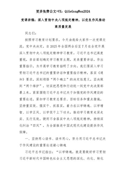 【七哥公文】2025年:党课讲稿:深入贯彻中央八项规定精神,以优良作风推动高质量发展+更多免费公文+VX:QiGeGongWen2024+更多免费公文+VX:QiGeGongWen2024
