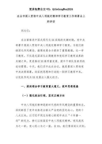 【七哥公文】2025年:在全市深入贯彻中央八项规定精神学习教育工作部署会上的讲话+更多免费公文+VX:QiGeGongWen2024+更多免费公文+VX:QiGeGongWen2024