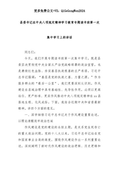 【七哥公文】2025年:县委书记在中央八项规定精神学习教育专题读书班第一次集中学习上的讲话+更多免费公文+VX:QiGeGongWen2024+更多免费公文+VX:QiGeGongWen2024
