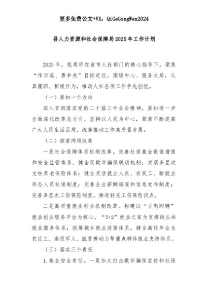 【七哥公文】2025年:县人力资源和社会保障局2025年工作计划+更多免费公文+VX:QiGeGongWen2024+更多免费公文+VX:QiGeGongWen2024