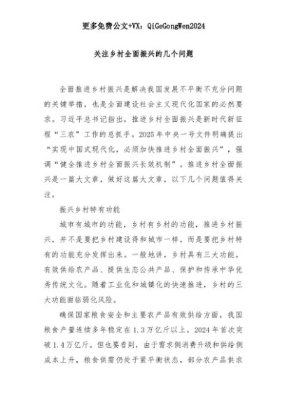 【七哥公文】2025年:关注乡村全面振兴的几个问题+更多免费公文+VX:QiGeGongWen2024+更多免费公文+VX:QiGeGongWen2024