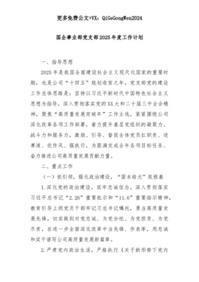 【七哥公文】2025年:国企事业部党支部2025年度工作计划+更多免费公文+VX:QiGeGongWen2024+更多免费公文+VX:QiGeGongWen2024