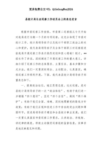 【七哥公文】2025年:县统计局长在巡察工作动员会上的表态发言+更多免费公文+VX:QiGeGongWen2024+更多免费公文+VX:QiGeGongWen2024
