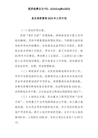 【七哥公文】2025年:县自然资源局2025年工作计划+更多免费公文+VX:QiGeGongWen2024+更多免费公文+VX:QiGeGongWen2024