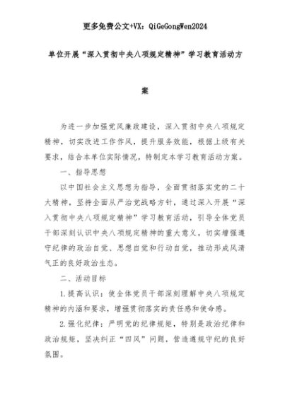【七哥公文】2025年:单位开展“深入贯彻中央八项规定精神”学习教育活动方案+更多免费公文+VX:QiGeGongWen2024+更多免费公文+VX:QiGeGongWen2024