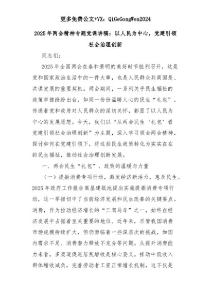 【七哥公文】2025年:2025年两会精神专题党课讲稿:以人民为中心,党建引领社会治理创新+更多免费公文+VX:QiGeGongWen2024+更多免费公文+VX:QiGeGongWen2024