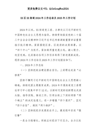 【七哥公文】2025年:XX区XX街道2024年工作总结及2025年工作计划+更多免费公文+VX:QiGeGongWen2024+更多免费公文+VX:QiGeGongWen2024