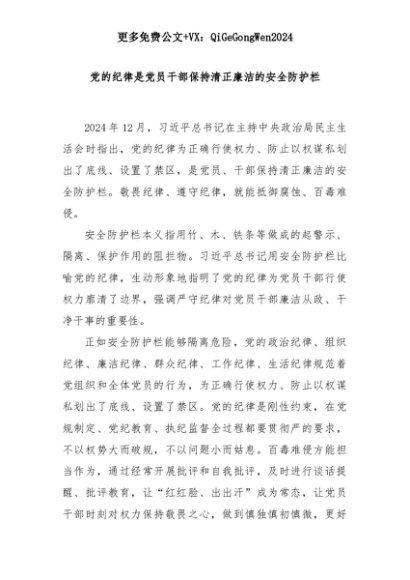【七哥公文】2025年:党的纪律是党员干部保持清正廉洁的安全防护栏+更多免费公文+VX:QiGeGongWen2024+更多免费公文+VX:QiGeGongWen2024