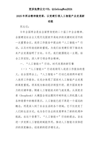 【七哥公文】2025年:2025年两会精神微党课:以党建引领人工智能产业发展新动能+更多免费公文+VX:QiGeGongWen2024+更多免费公文+VX:QiGeGongWen2024