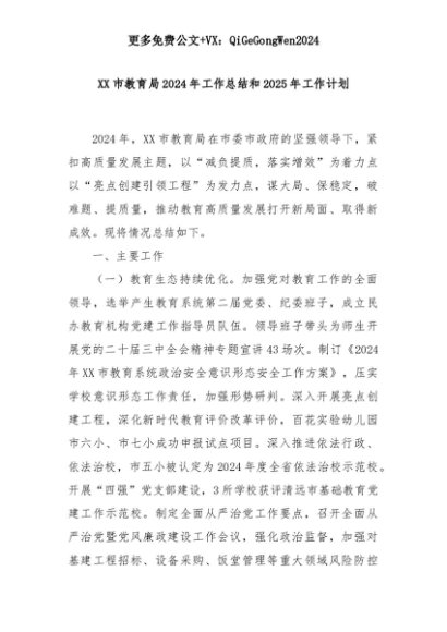 【七哥公文】2025年:XX市教育局2024年工作总结和2025年工作计划+更多免费公文+VX:QiGeGongWen2024+更多免费公文+VX:QiGeGongWen2024
