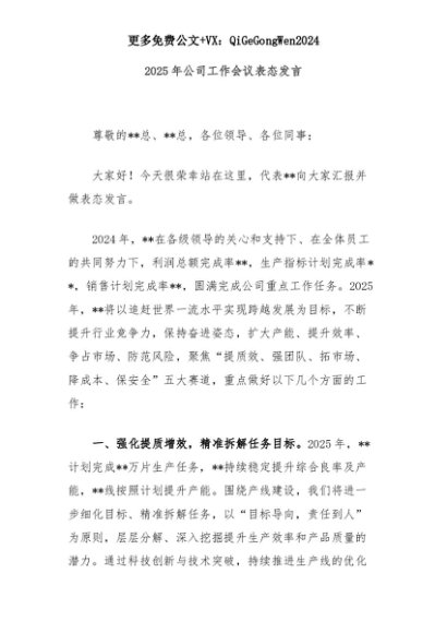 【七哥公文】2025年:2025年公司工作会议表态发言+更多免费公文+VX:QiGeGongWen2024+更多免费公文+VX:QiGeGongWen2024
