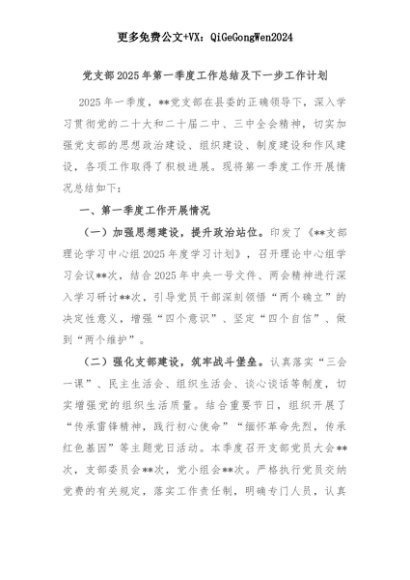【七哥公文】2025年:党支部2025年第一季度工作总结及下一步工作计划+更多免费公文+VX:QiGeGongWen2024+更多免费公文+VX:QiGeGongWen2024