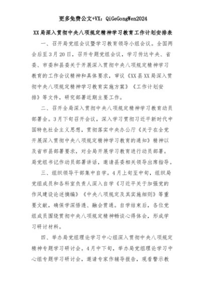 【七哥公文】2025年:XX局深入贯彻中央八项规定精神学习教育工作计划安排表+更多免费公文+VX:QiGeGongWen2024+更多免费公文+VX:QiGeGongWen2024