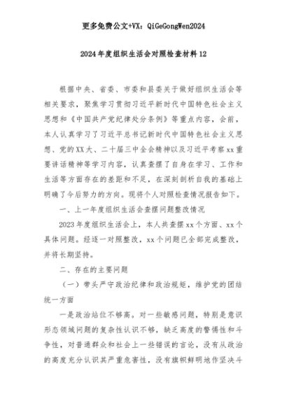 【七哥公文】2025年:2024年度组织生活会对照检查材料12+更多免费公文+VX:QiGeGongWen2024+更多免费公文+VX:QiGeGongWen2024
