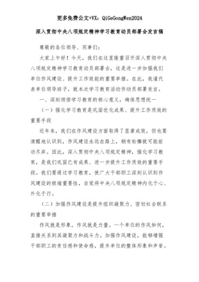 【七哥公文】2025年:深入贯彻中央八项规定精神学习教育动员部署会发言稿+更多免费公文+VX:QiGeGongWen2024+更多免费公文+VX:QiGeGongWen2024