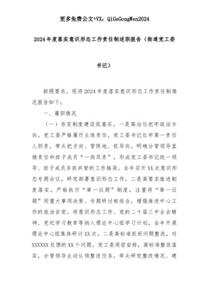 【七哥公文】2025年:2024年度落实意识形态工作责任制述职报告(街道党工委书记)+更多免费公文+VX:QiGeGongWen2024+更多免费公文+VX:QiGeGongWen2024