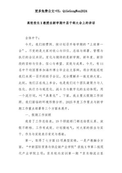 【七哥公文】2025年:高校校长X教授在新学期中层干部大会上的讲话+更多免费公文+VX:QiGeGongWen2024+更多免费公文+VX:QiGeGongWen2024