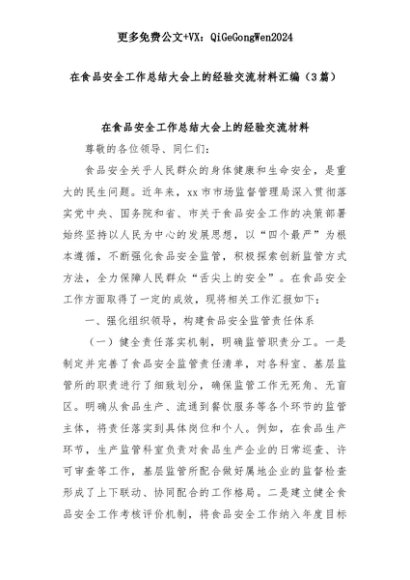 【七哥公文】2025年:(3篇)在食品安全工作总结大会上的经验交流材料汇编+更多免费公文+VX:QiGeGongWen2024+更多免费公文+VX:QiGeGongWen2024