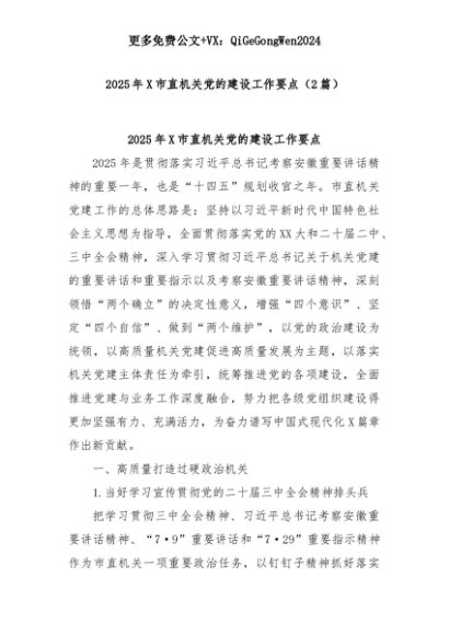 【七哥公文】2025年:(2篇)2025年X市直机关党的建设工作要点2+更多免费公文+VX:QiGeGongWen2024+更多免费公文+VX:QiGeGongWen2024