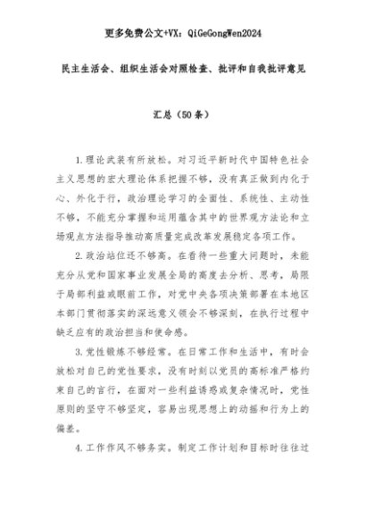 【七哥公文】2025年:(50条)民主生活会、组织生活会对照检查、批评和自我批评意见汇总+更多免费公文+VX:QiGeGongWen2024+更多免费公文+VX:QiGeGongWen2024