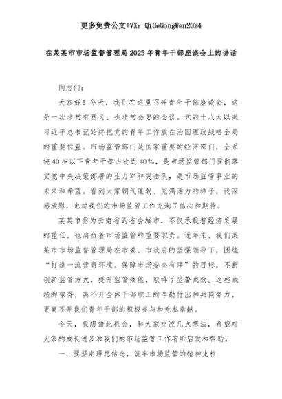 【七哥公文】2025年:在某某市市场监督管理局2025年青年干部座谈会上的讲话+更多免费公文+VX:QiGeGongWen2024+更多免费公文+VX:QiGeGongWen2024