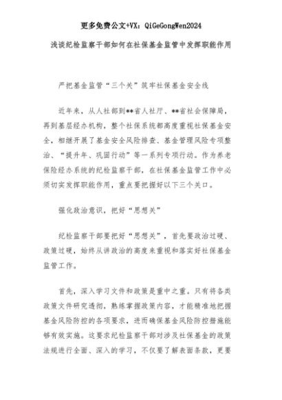 【七哥公文】2025年:浅谈纪检监察干部如何在社保基金监管中发挥职能作用+更多免费公文+VX:QiGeGongWen2024+更多免费公文+VX:QiGeGongWen2024