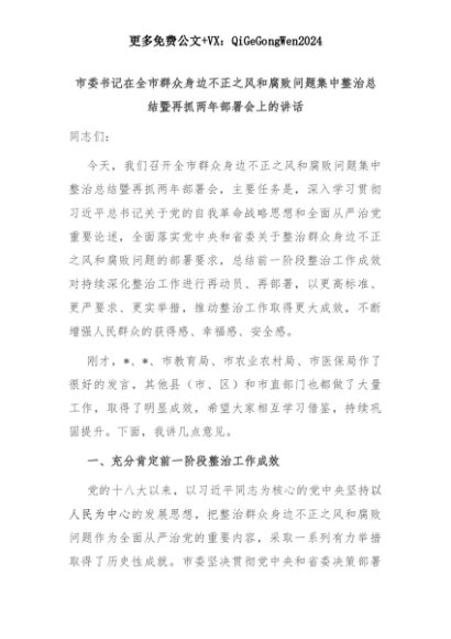 【七哥公文】2025年:市委书记在全市群众身边不正之风和腐败问题集中整治总结暨再抓两年部署会上的讲话+更多免费公文+VX:QiGeGongWen2024+更多免费公文+VX:QiGeGongWen2024