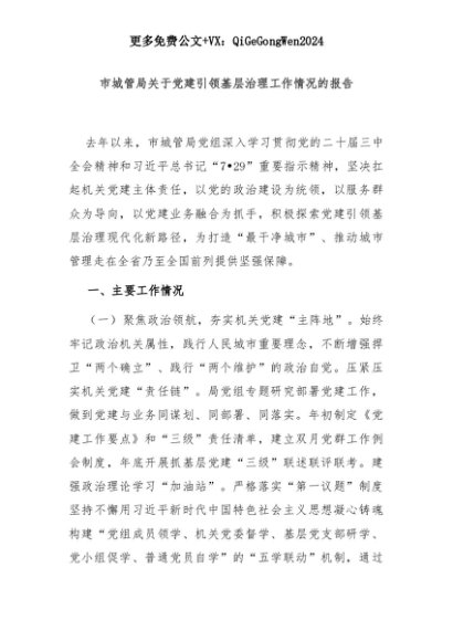 【七哥公文】2025年:市城管局关于党建引领基层治理工作情况的报告+更多免费公文+VX:QiGeGongWen2024+更多免费公文+VX:QiGeGongWen2024