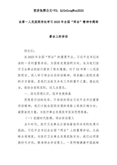 【七哥公文】2025年:在第一人民医院传达学习2025年全国“两会”精神专题部署会上的讲话+更多免费公文+VX:QiGeGongWen2024+更多免费公文+VX:QiGeGongWen2024