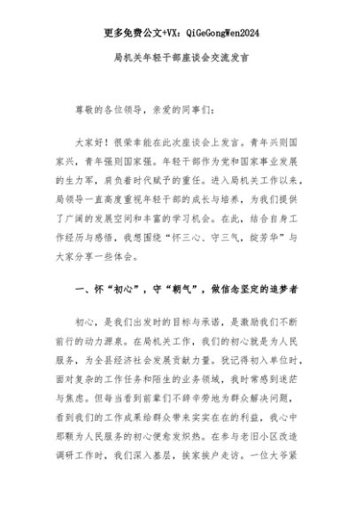 【七哥公文】2025年:局机关年轻干部座谈会交流发言+更多免费公文+VX:QiGeGongWen2024+更多免费公文+VX:QiGeGongWen2024