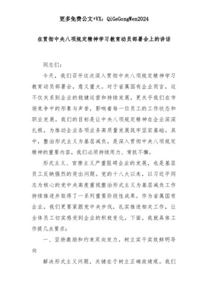 【七哥公文】2025年:在贯彻中央八项规定精神学习教育动员部署会上的讲话+更多免费公文+VX:QiGeGongWen2024+更多免费公文+VX:QiGeGongWen2024